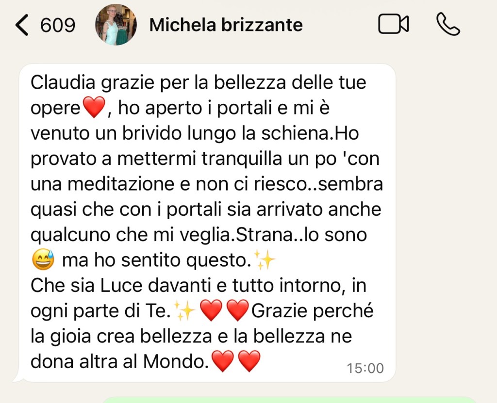 l’apertura dei portali energetici attraverso l’opera ha generato una forte percezione fisica, un brivido lungo la schiena, una sensazione di presenza e di luce diffusa tutt’intorno.